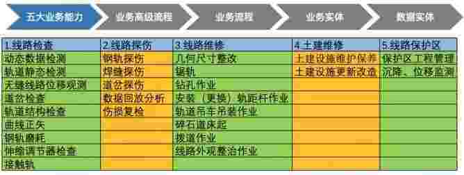 在轨道运维业务中,,,,,,,,,,,,,,我们形成了完整的从业务能力(业务域)-业务流程-业务实体-数据模型的分析梳理过程。。。。。。。。轨道运维业务能力如下图所示:::::
